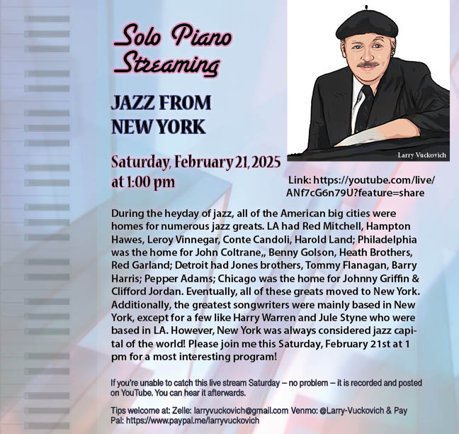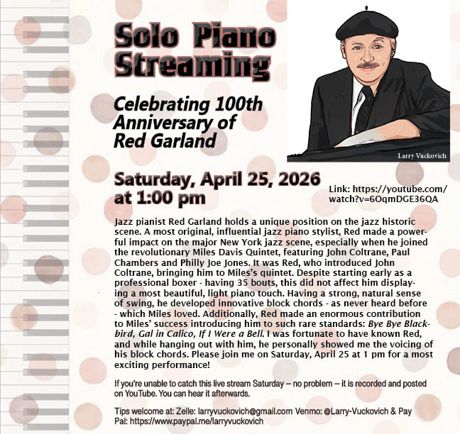 Admission: Donations can be made via Zelle (larryvuckovich@gmail.com), Venmo (@Larry-Vuckovich), & Paypal paypal.me/larryvuckovich